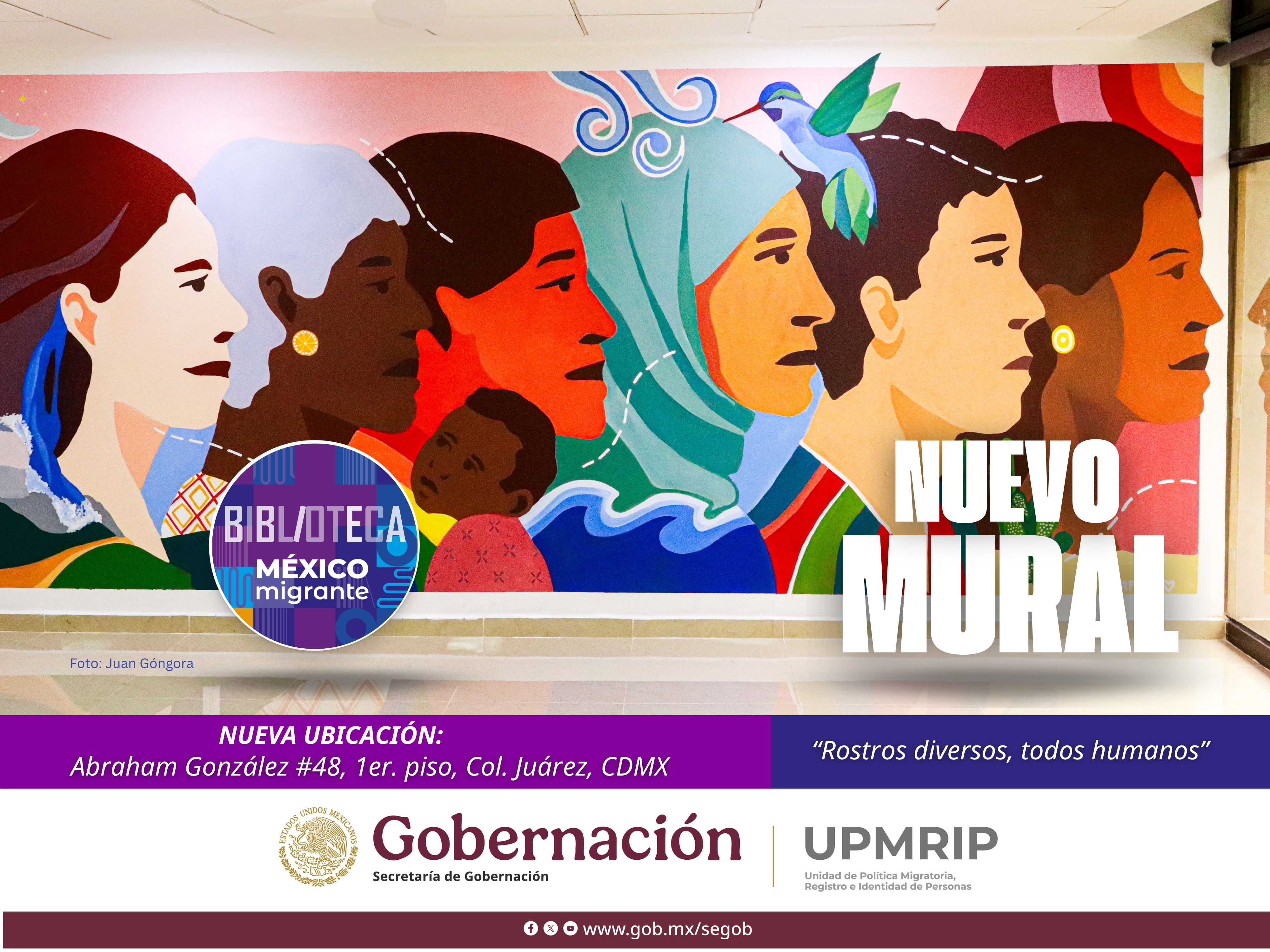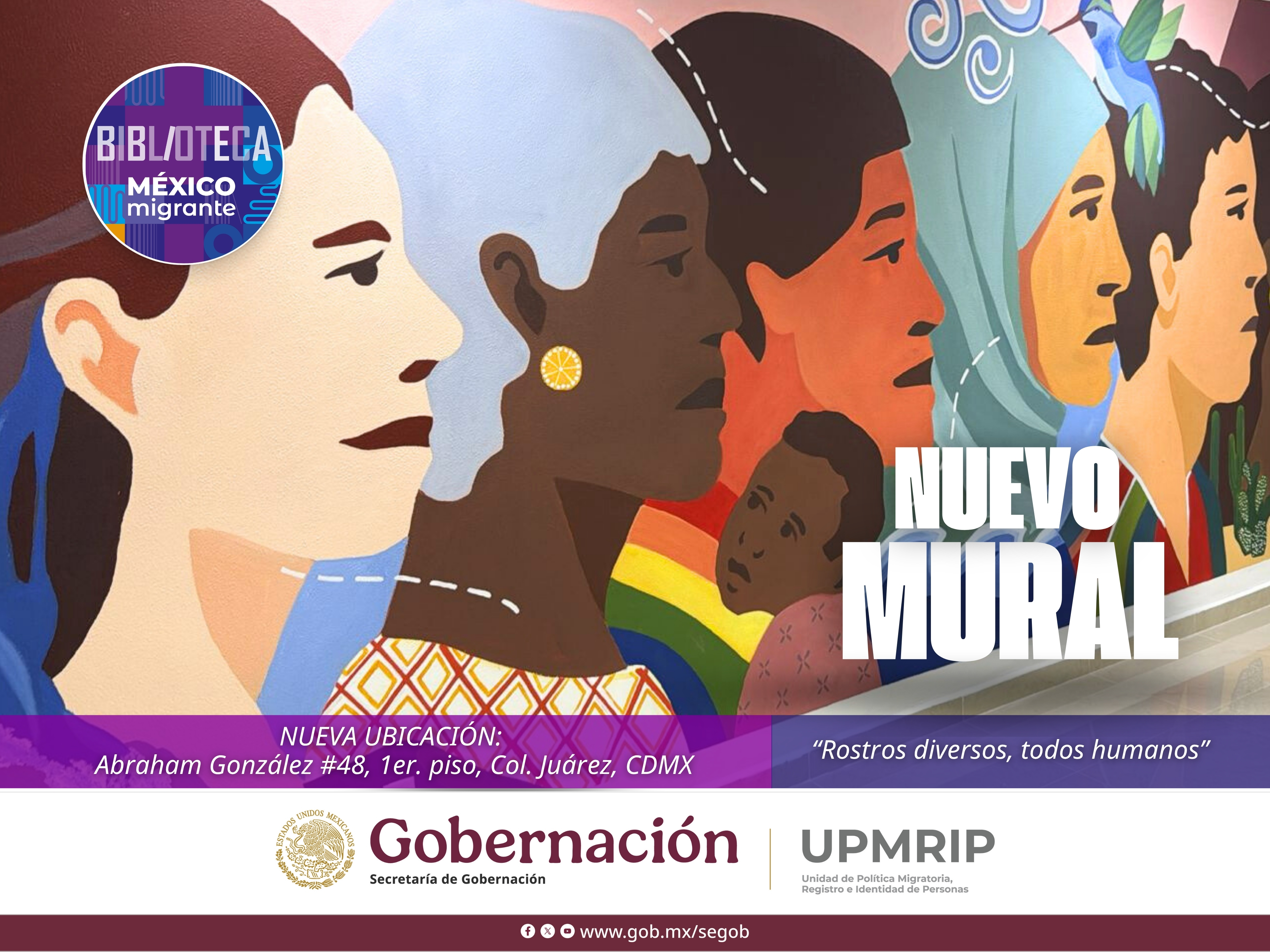 Objetivo: Invitar al público en general a visitar el mural “Rostros humanos, rostros diversos” en la Biblioteca México Migrante, con el propósito de sensibilizar sobre la diversidad, dignidad y humanidad de las personas en contextos de movilidad, a través del arte como una herramienta para el reconocimiento y la empatía hacia quienes migran.