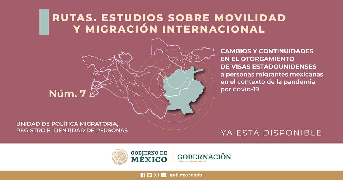 'Rutas. Estudios sobre movilidad y migración internacional. Cambios y continuidades en el otorgamiento de visas estadounidenses a personas migrantes mexicanas en el contexto de pandemia por Covid-19'. La más reciente publicación especializada del Centro de Estudios Migratorios de la UPMRIP, se suma a los estudios y productos estadísticos que generan evidencia empírica para incidir en la formulación y transformación de las políticas públicas de movilidad humana del Gobierno de México. ¡Rutas7, conócela, descárgala y compártela!