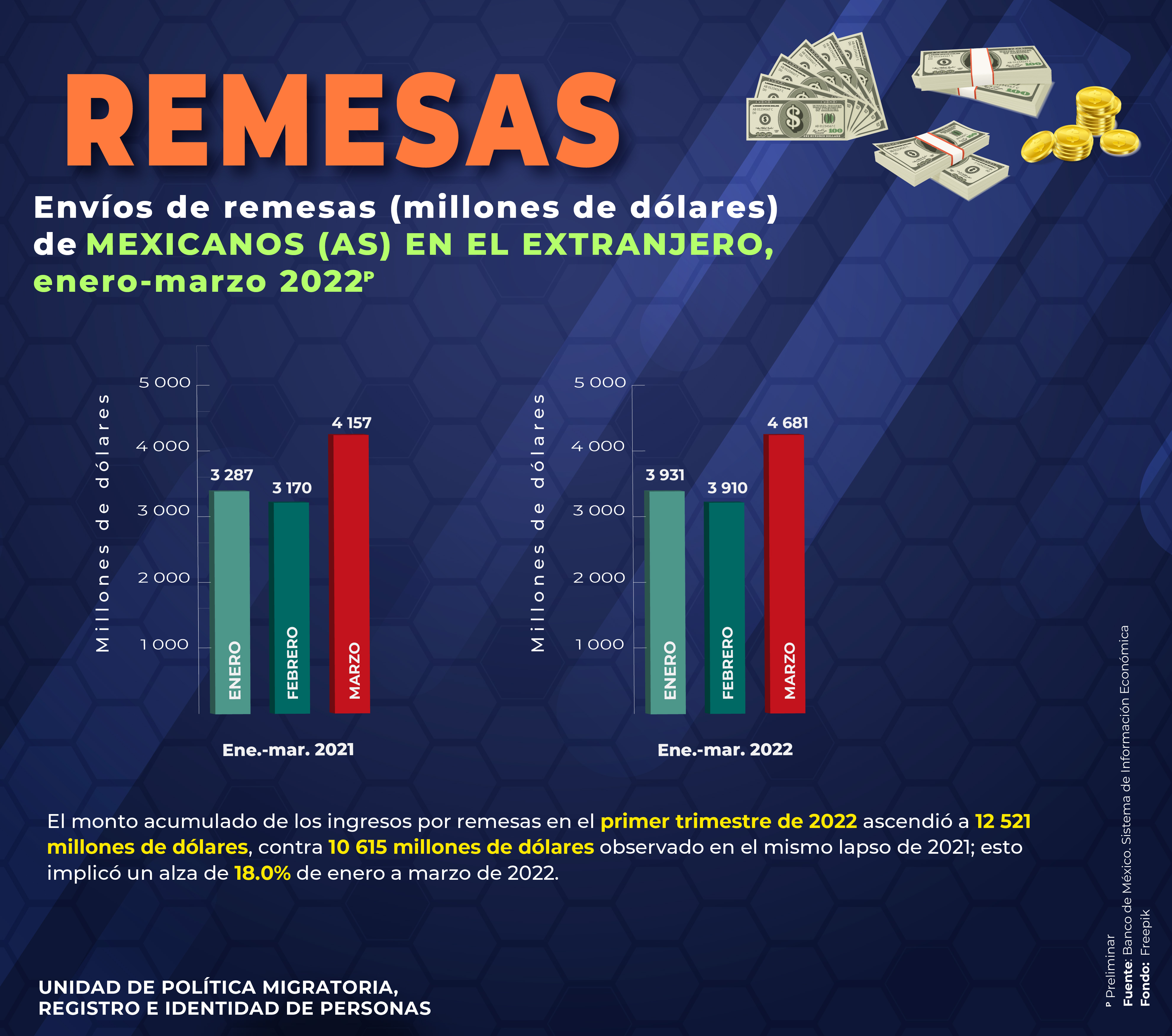 - Envíos de remesas (millones de dólares) de Mexicanos(as) en el extranjero, enero-marzo 2022
