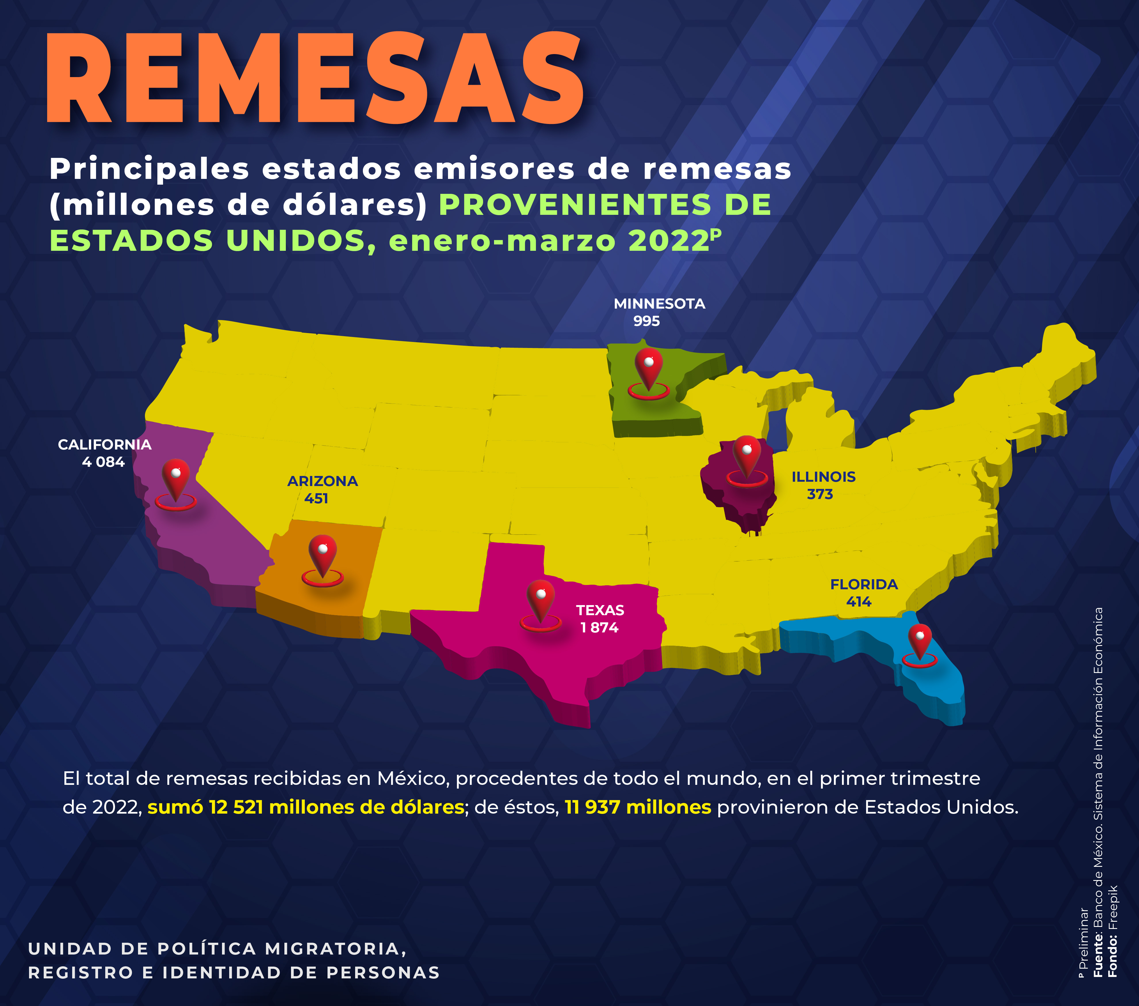 - Principales estados emisores de remesas (millones de dólares) provenientes de Estados Unidos, enero-marzo 2022