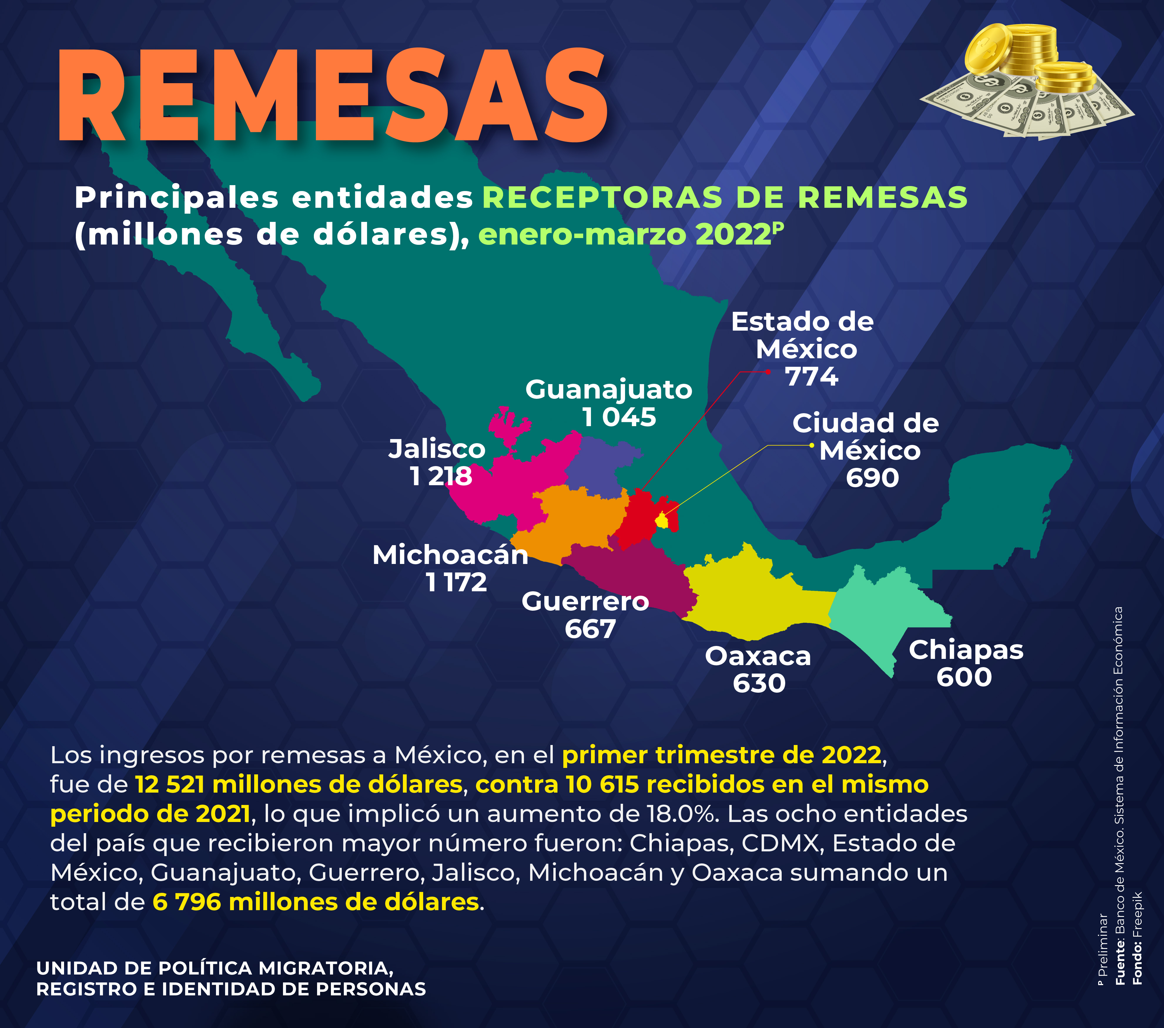 - Principales entidades receptoras de remesas (millones de dólares), enero-marzo 2022