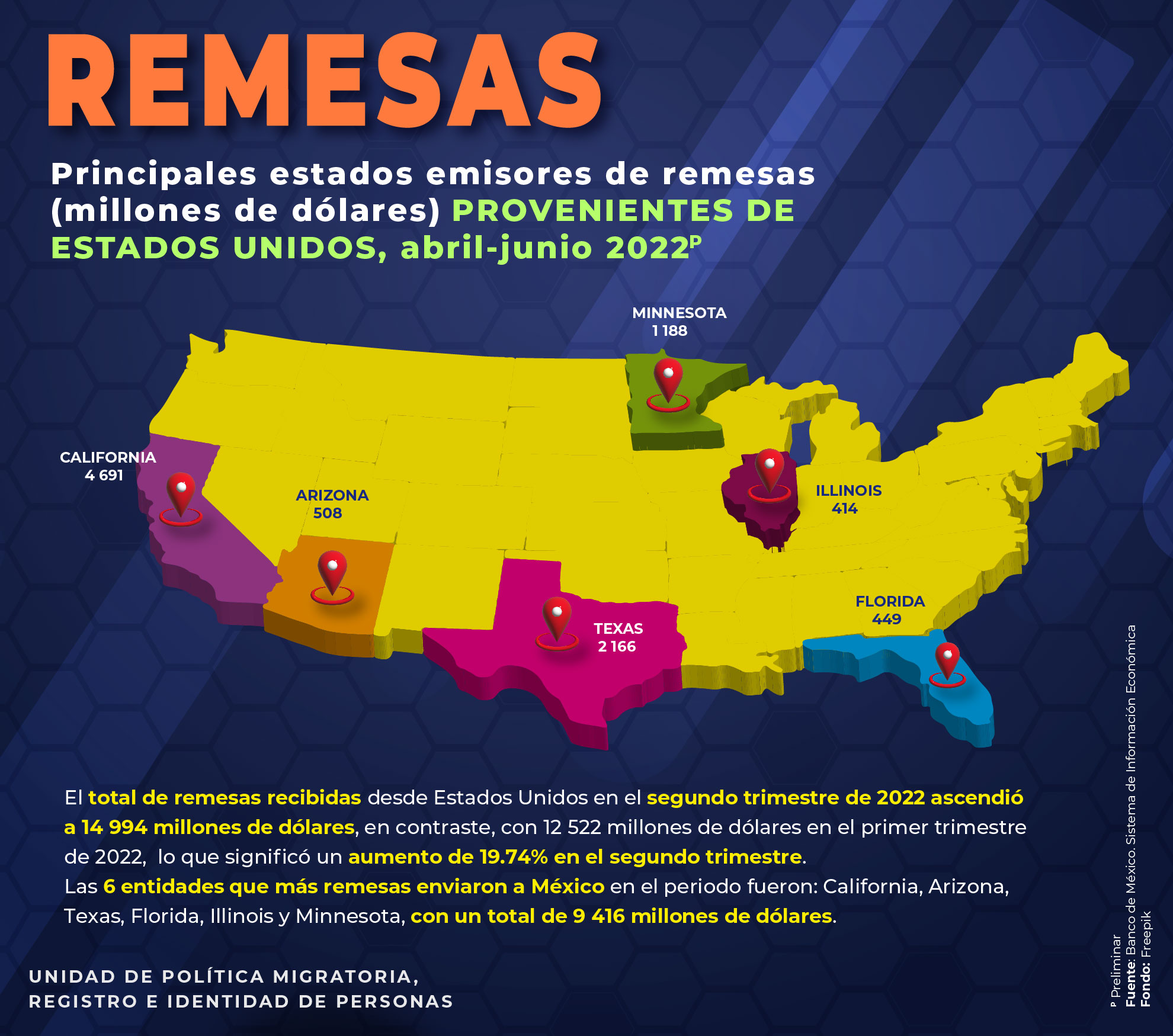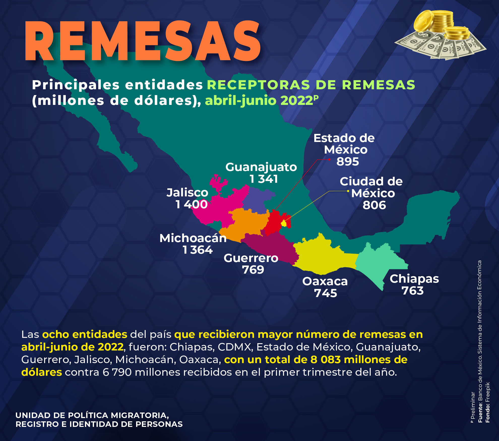- Principales estados emisores de remesas (millones de dólares) provenientes de Estados Unidos, abril-junio 2022