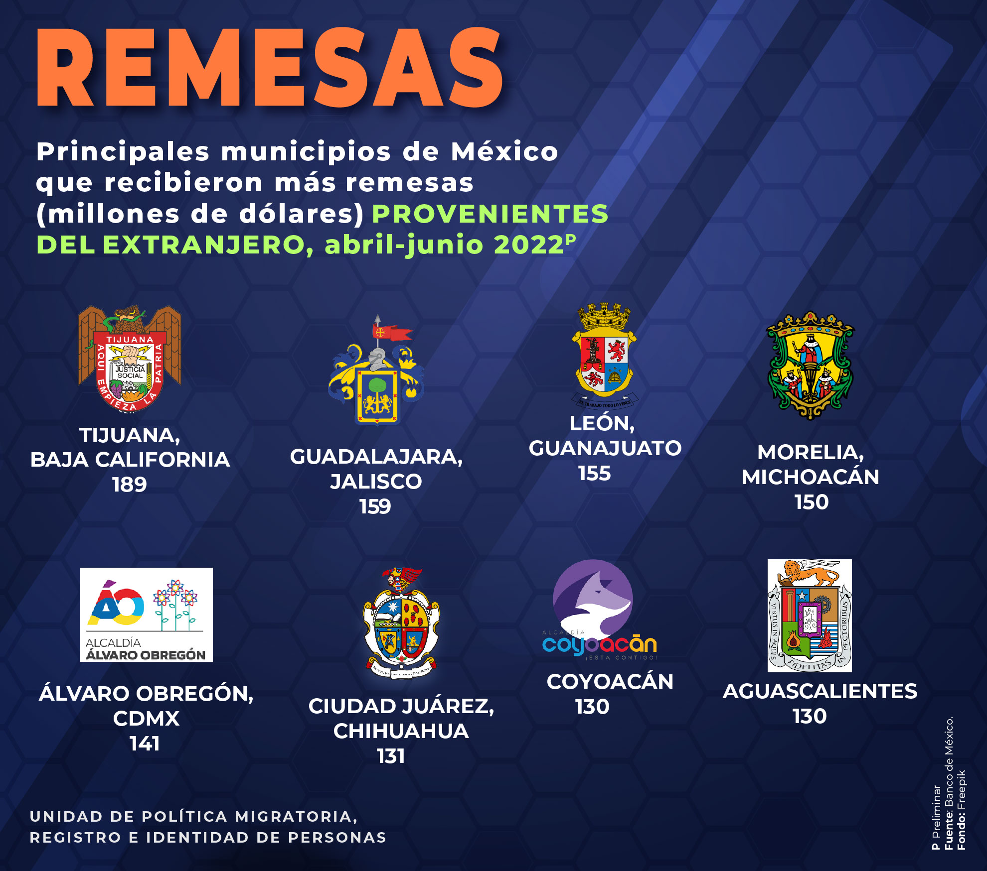 - Principales municipios de México que recibieron más remesas (millones de dólares) provenientes del extranjero, abril-junio 2022
