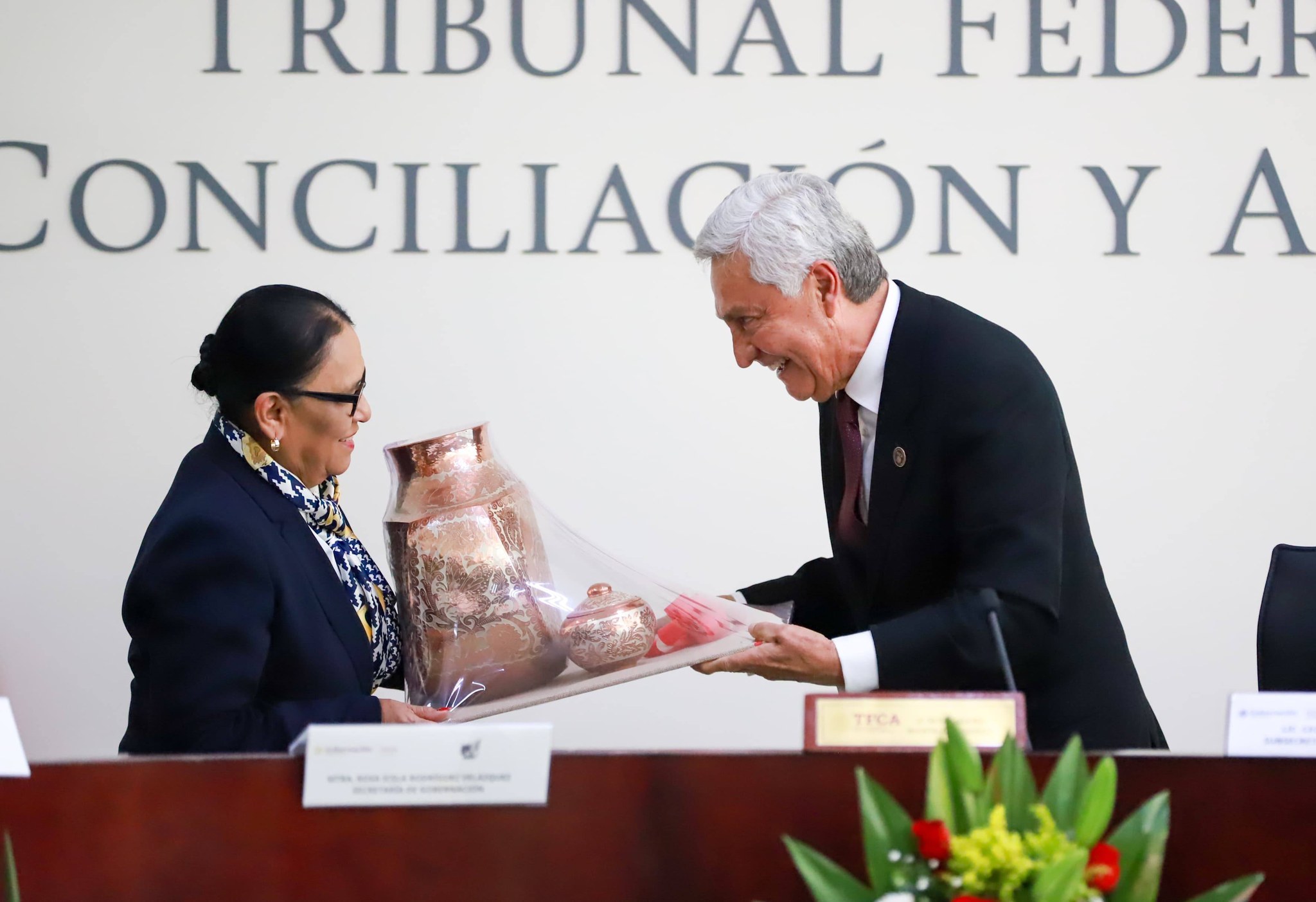 El Magistrado Presidente Cristóbal Arias Solís le entregó a la Secretaria de Gobernación un reconocimiento a su trayectoria firmado por todos los Magistrados y Magistradas del Tribunal, y un presente elaborado por artesanos de Santa Clara del Cobre, Michoacán.