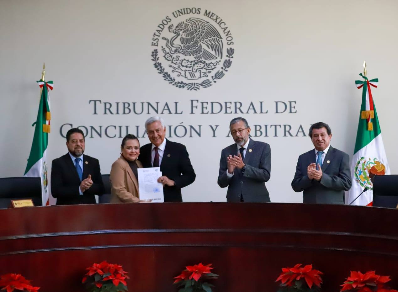 Bajo la Presidencia del Magistrado Cristóbal Arias Solís, el Tribunal Federal de Conciliación y Arbitraje celebró este jueves 4 de diciembre la Cuadragésima Segunda Sesión Ordinaria del Pleno, a la que acudieron como invitados de honor los Presidentes Colegiados de la Federación Democrática de Sindicatos de Servidores Públicos: el Mtro. Agustín Avilés Noguera, el Lcdo. Raúl Waldemaro Montalvo Magaña, la Mtra. María Eugenia Dávalos González y el Lcdo. Víctor Bernardo López Carranza, para la entrega de Tomas de Nota a sindicatos afiliados a la FEDESSP.