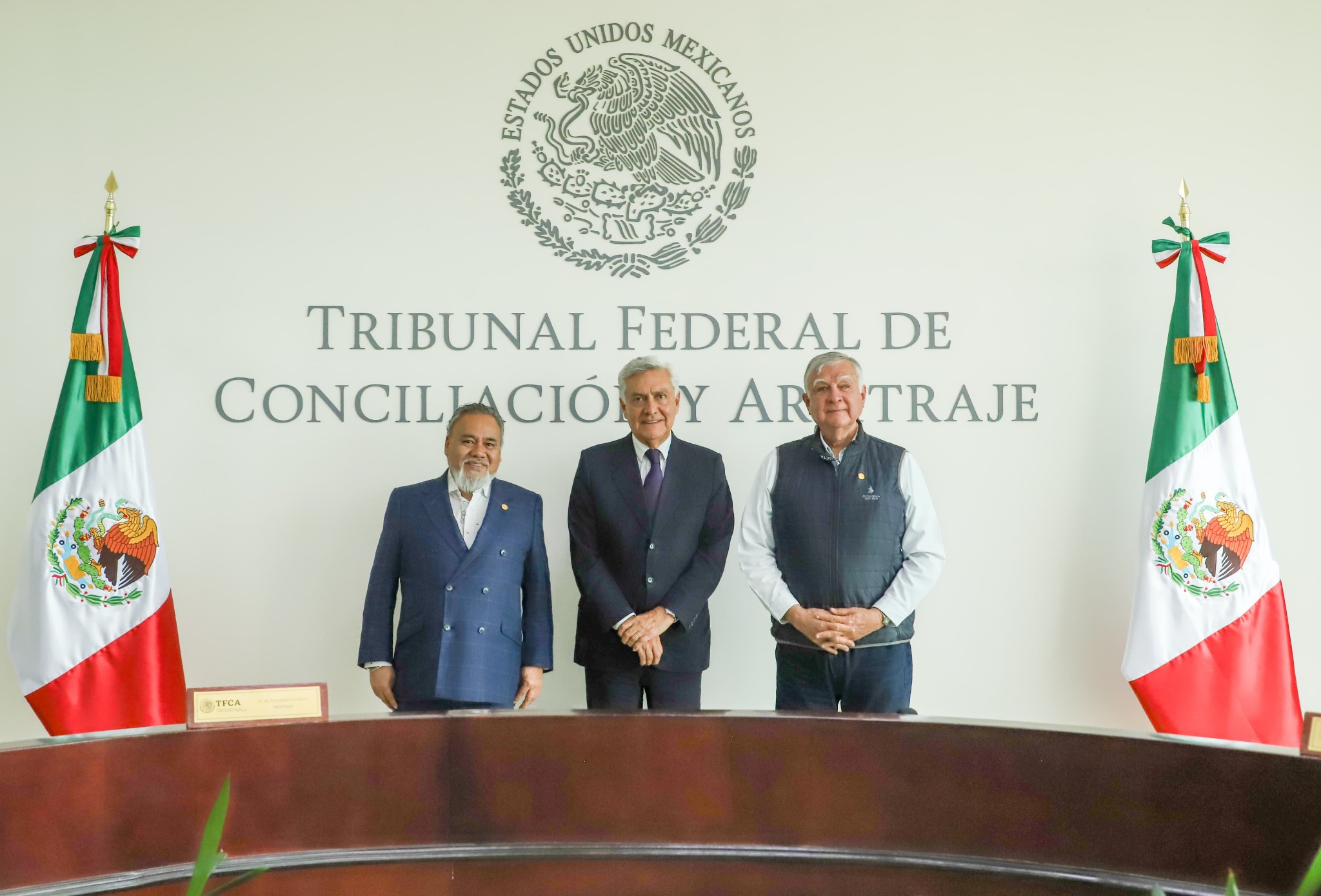 El Magistrado Presidente del Tribunal Federal de Conciliación y Arbitraje Cristóbal Arias Solís, sostuvo una reunión de trabajo con los dirigentes del Sindicato Nacional de Controladores de Tránsito Aéreo (SINACTA), José Alfredo Covarrubias Aguilar y Ángel Iturbe Strop, para analizar la problemática laboral de los servidores públicos de los que depende la certeza de despegues y aterrizajes.