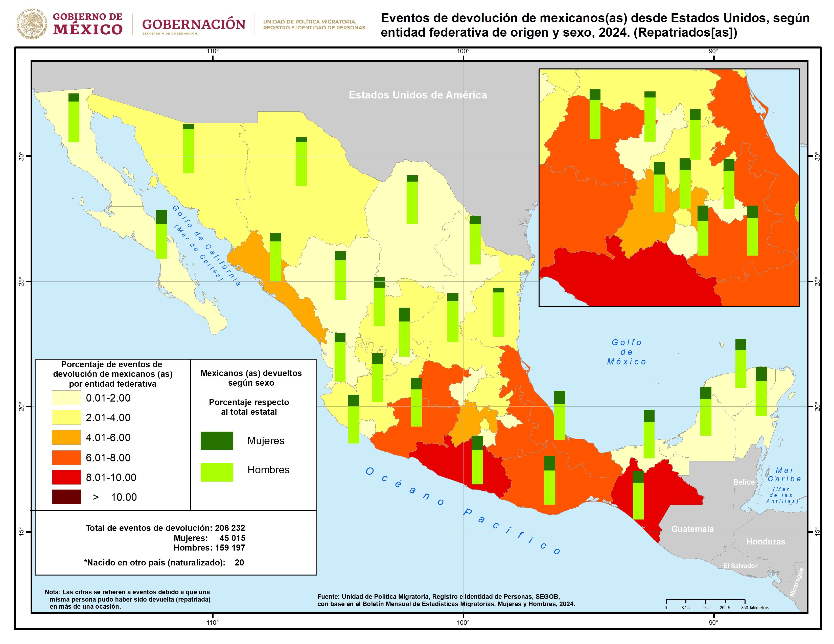 - Eventos de devolución de mexicanos(as) desde Estados Unidos, según entidad federativa de origen y sexo, 2024. (Repatriados[as])