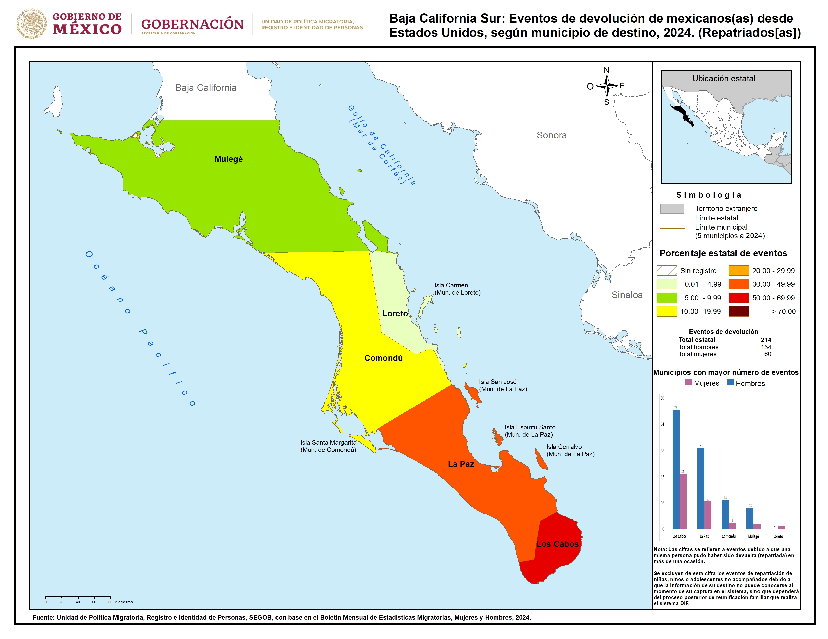 - Baja California Sur: Eventos de devolución de mexicanos(as) desde Estados Unidos, según municipio de destino, 2024. (Repatriados[as])