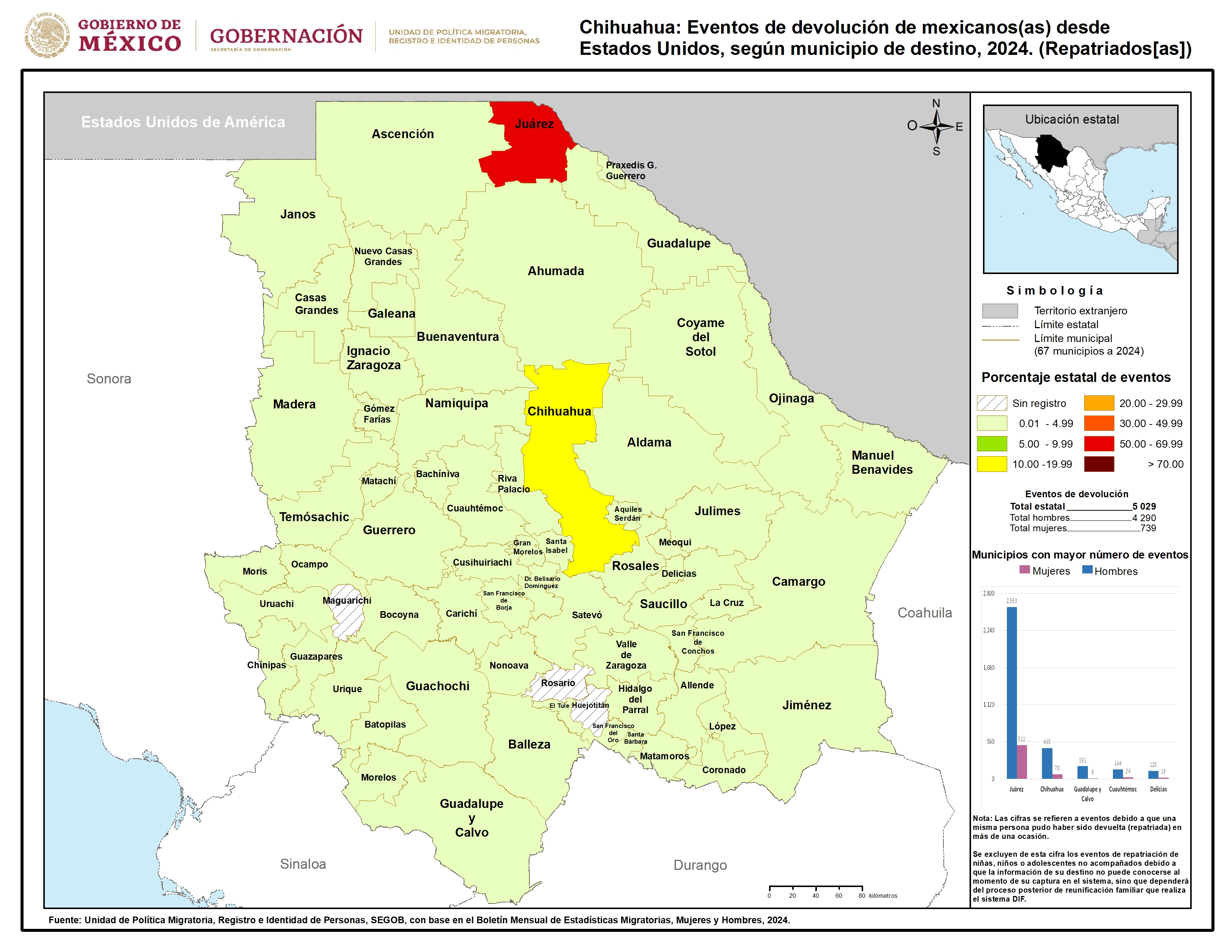 - Chihuahua: Eventos de devolución de mexicanos(as) desde Estados Unidos, según municipio de destino, 2024. (Repatriados[as])