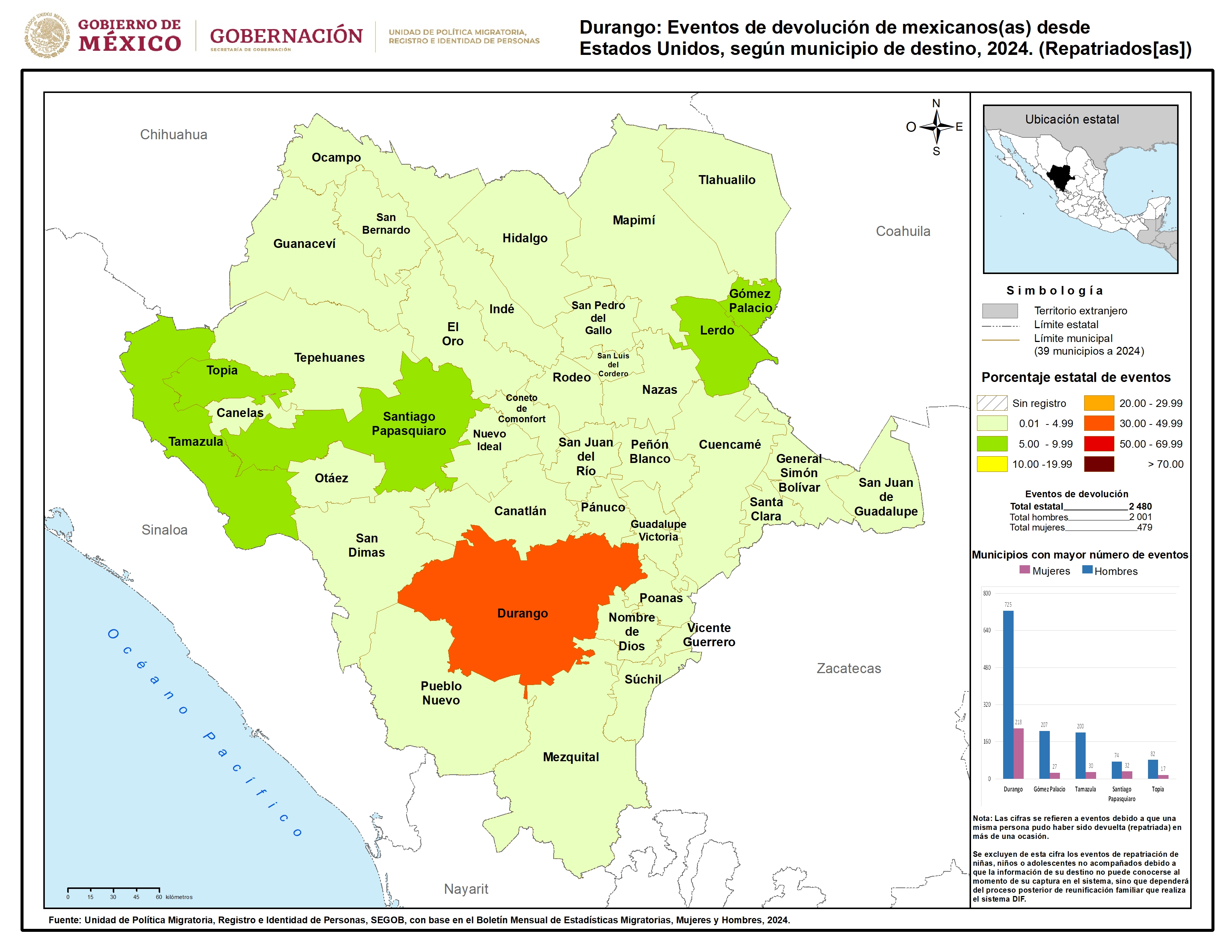 - Durango: Eventos de devolución de mexicanos(as) desde Estados Unidos, según municipio de destino, 2024. (Repatriados[as])