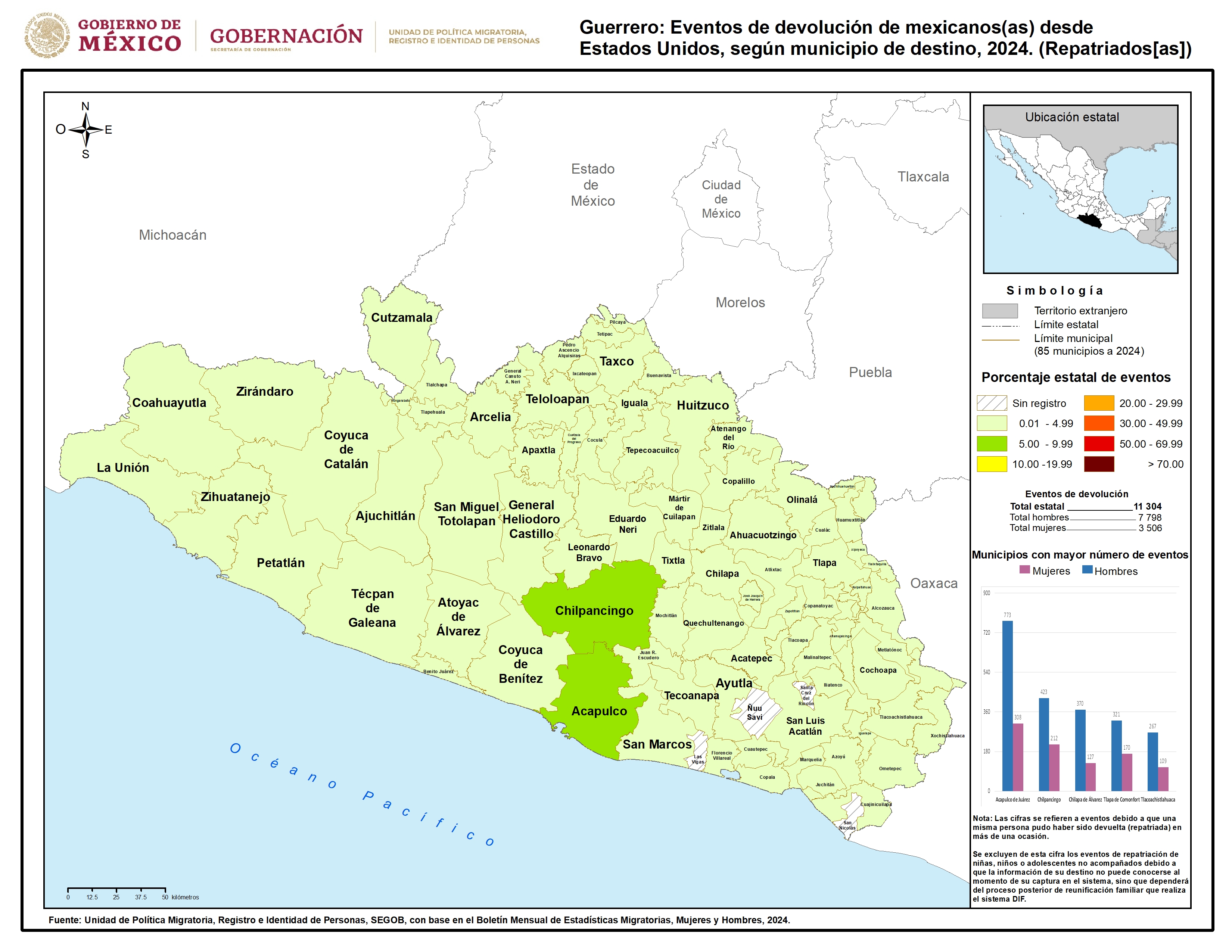 - Guerrero: Eventos de devolución de mexicanos(as) desde Estados Unidos, según municipio de destino, 2024. (Repatriados[as])