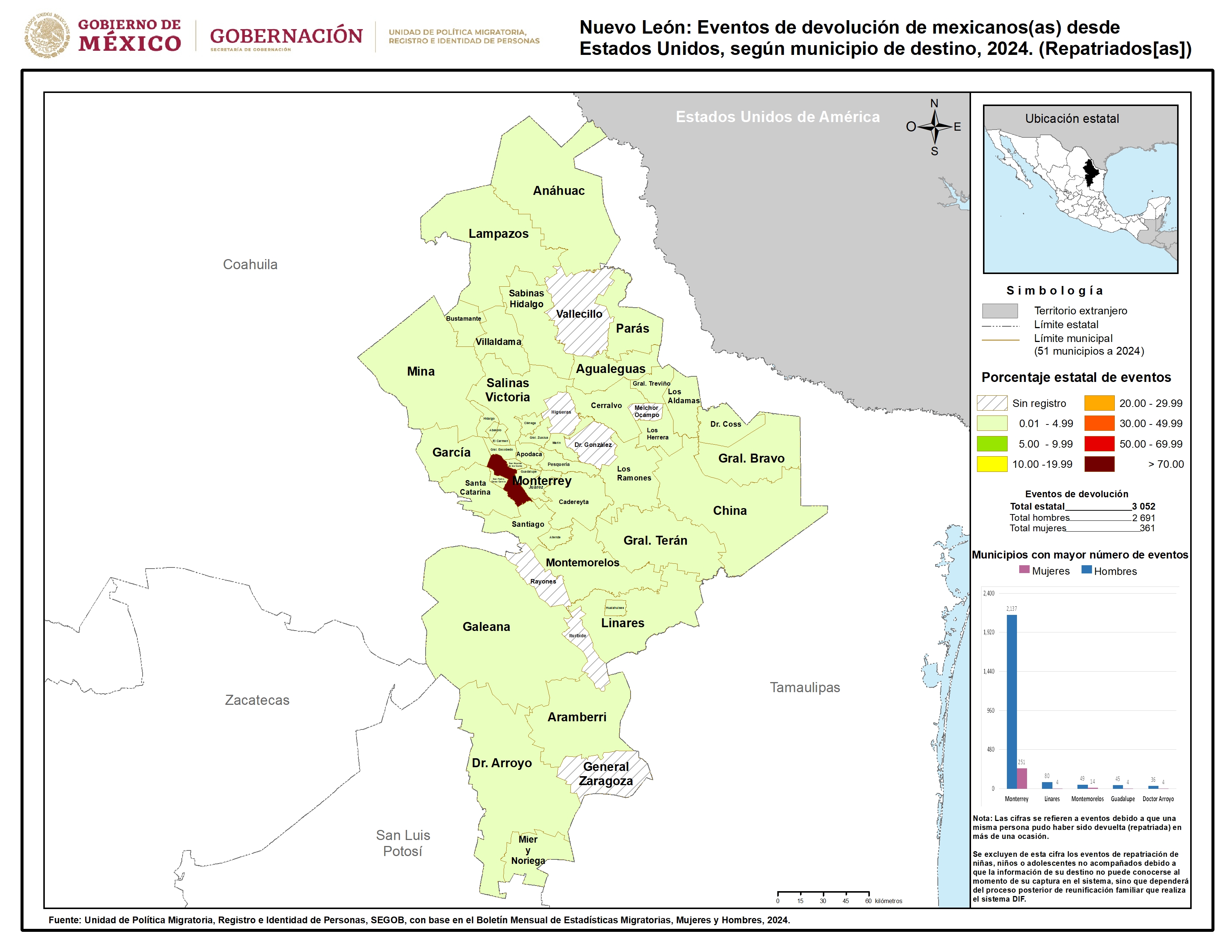 - Nuevo León: Eventos de devolución de mexicanos(as) desde Estados Unidos, según municipio de destino, 2024. (Repatriados[as])