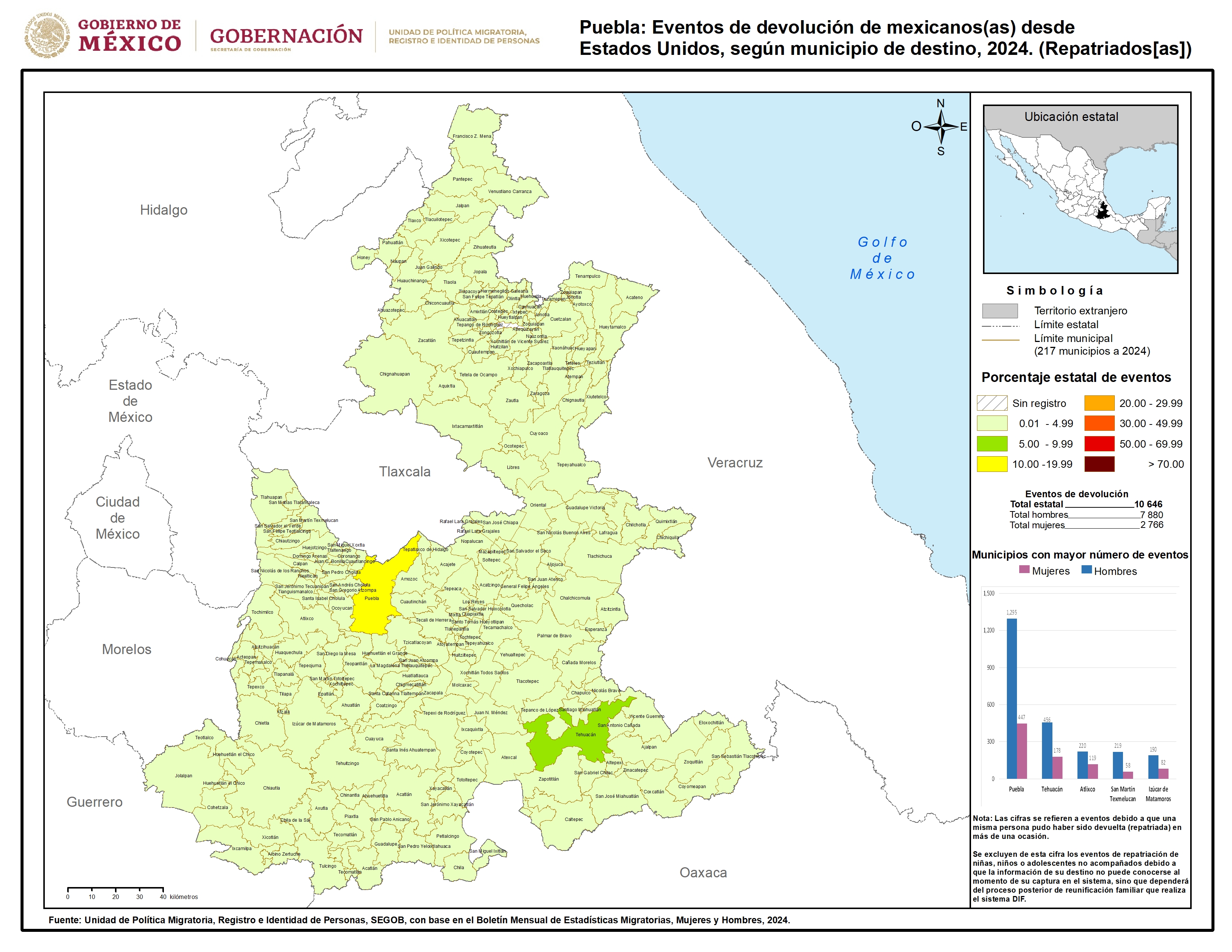 - Puebla: Eventos de devolución de mexicanos(as) desde Estados Unidos, según municipio de destino, 2024. (Repatriados[as])