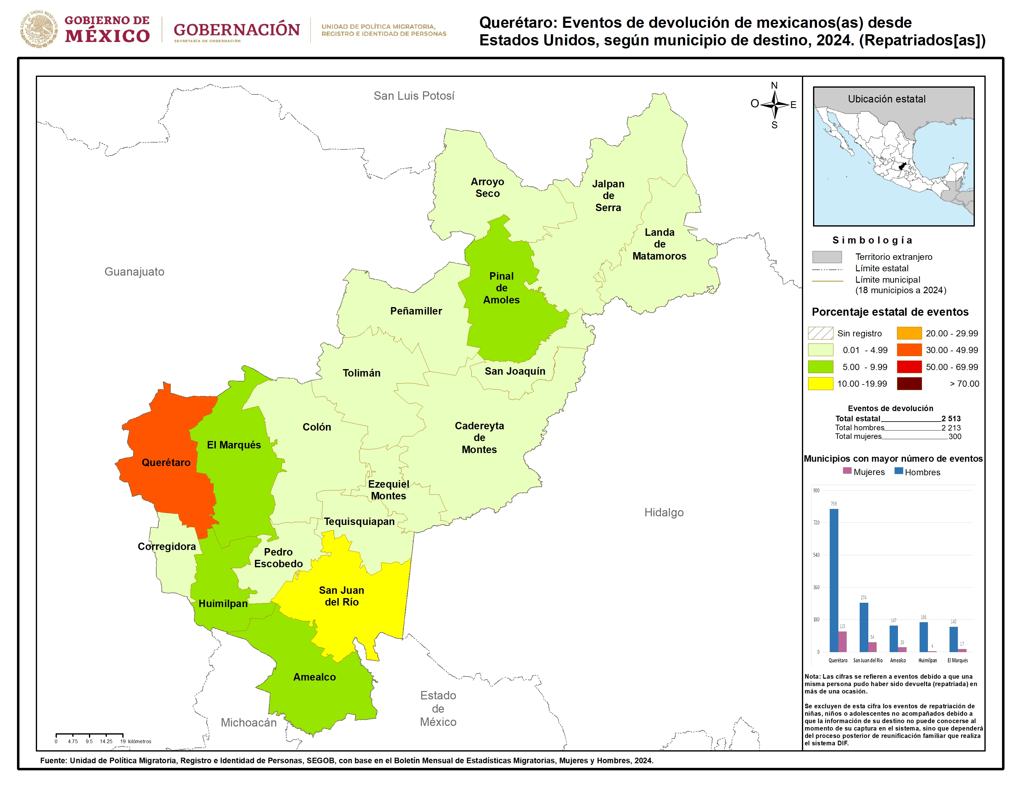 - Querétaro: Eventos de devolución de mexicanos(as) desde Estados Unidos, según municipio de destino, 2024. (Repatriados[as])
