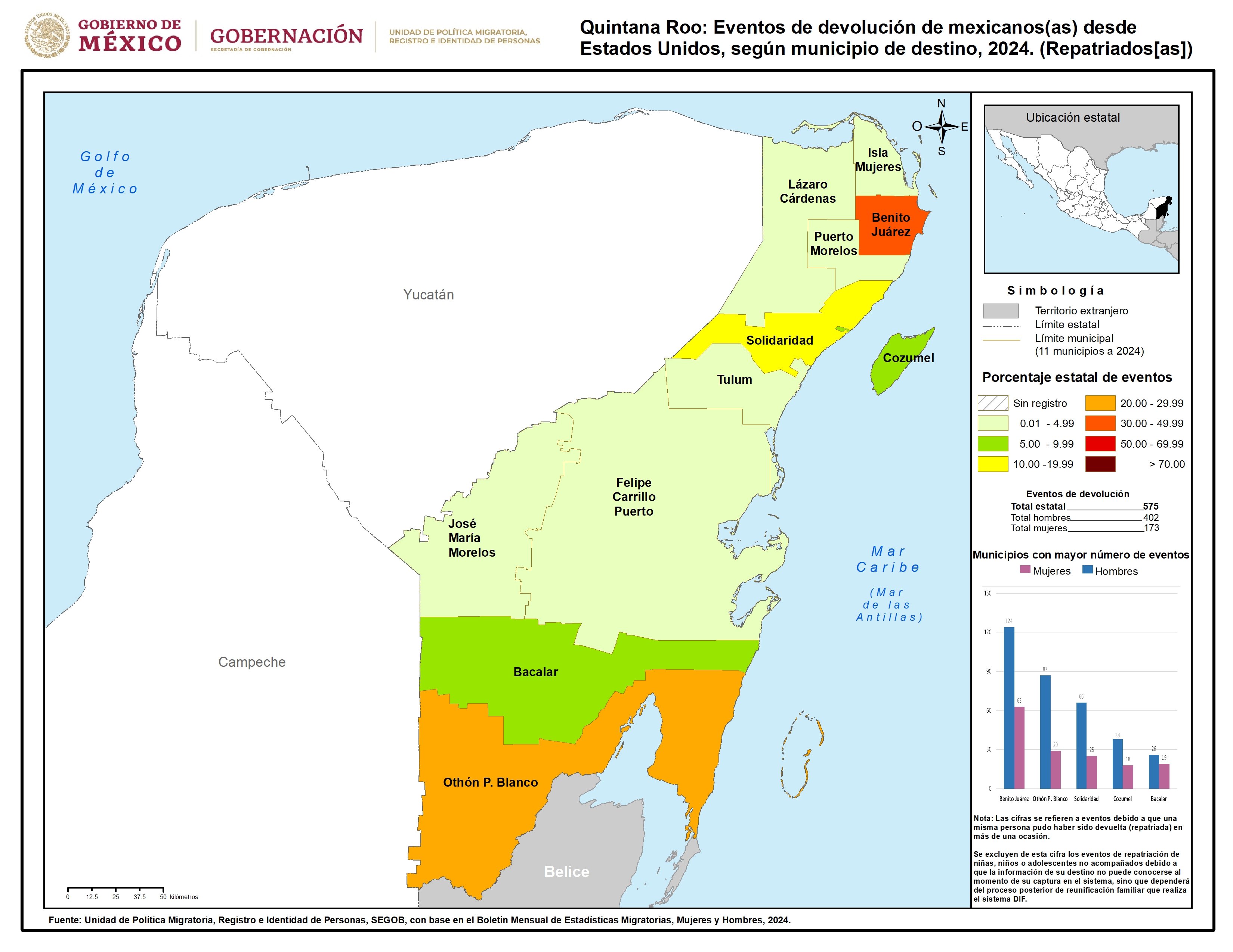 - Quintana Roo: Eventos de devolución de mexicanos(as) desde Estados Unidos, según municipio de destino, 2024. (Repatriados[as])