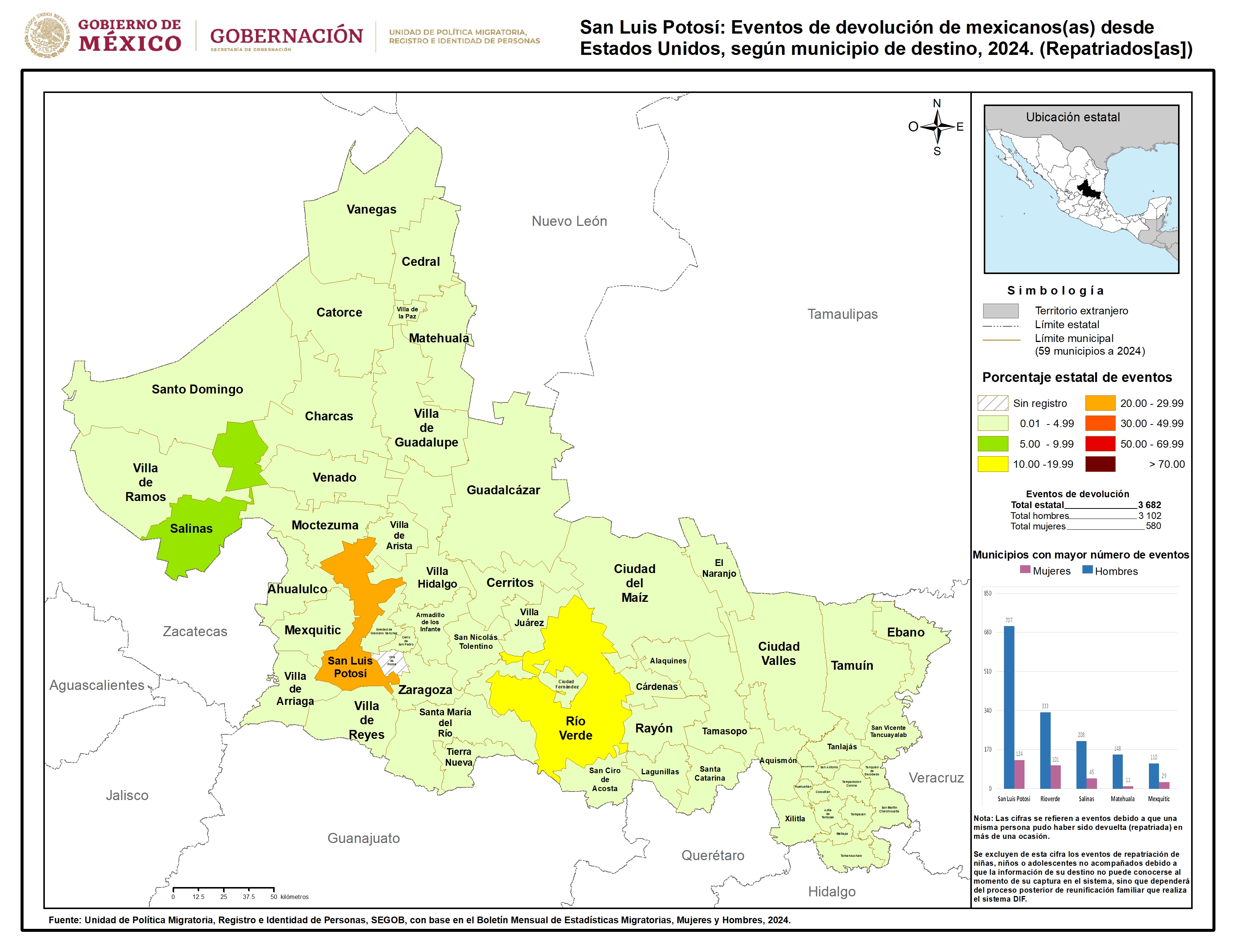 - San Luis Potosí: Eventos de devolución de mexicanos(as) desde Estados Unidos, según municipio de destino, 2024. (Repatriados[as])