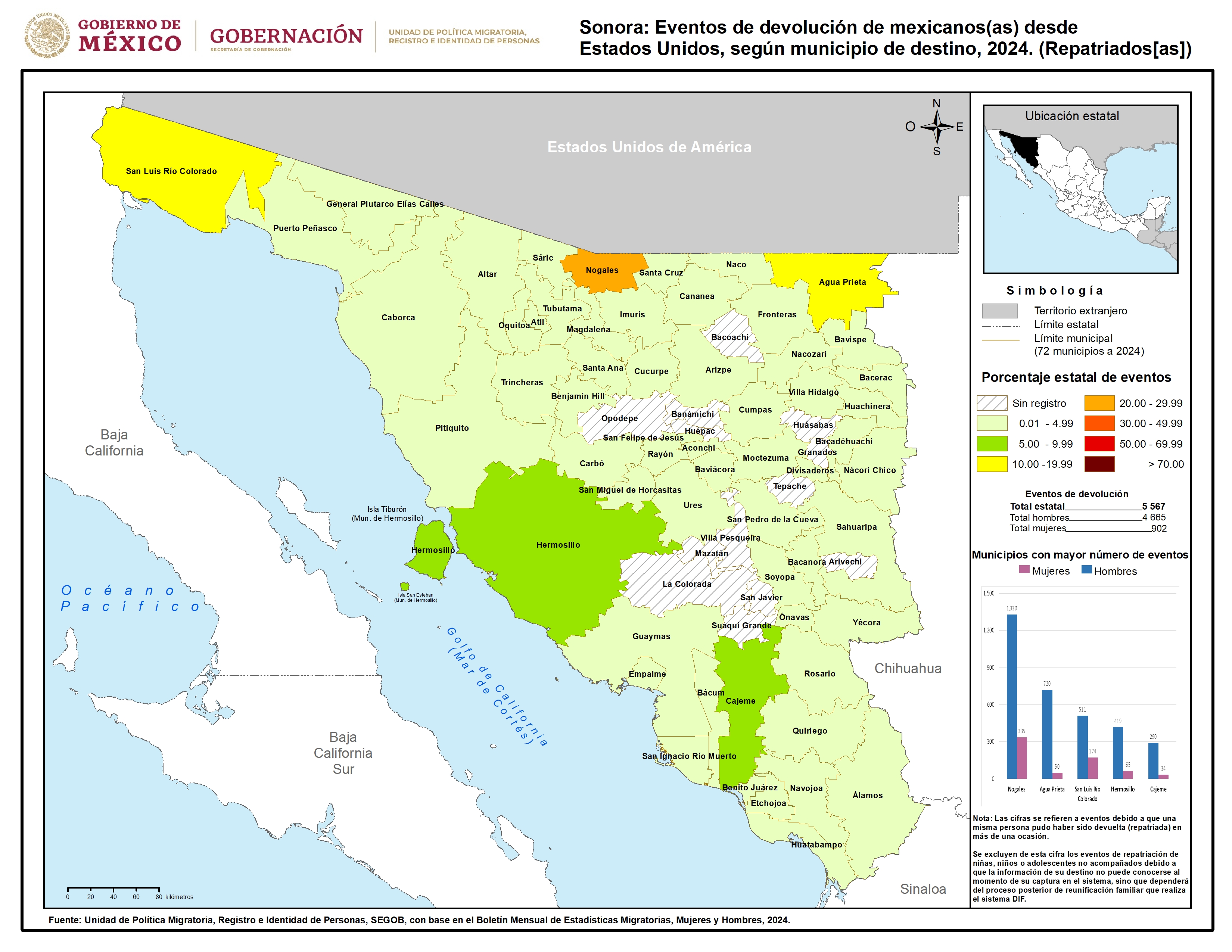 - Sonora: Eventos de devolución de mexicanos(as) desde Estados Unidos, según municipio de destino, 2024. (Repatriados[as])
