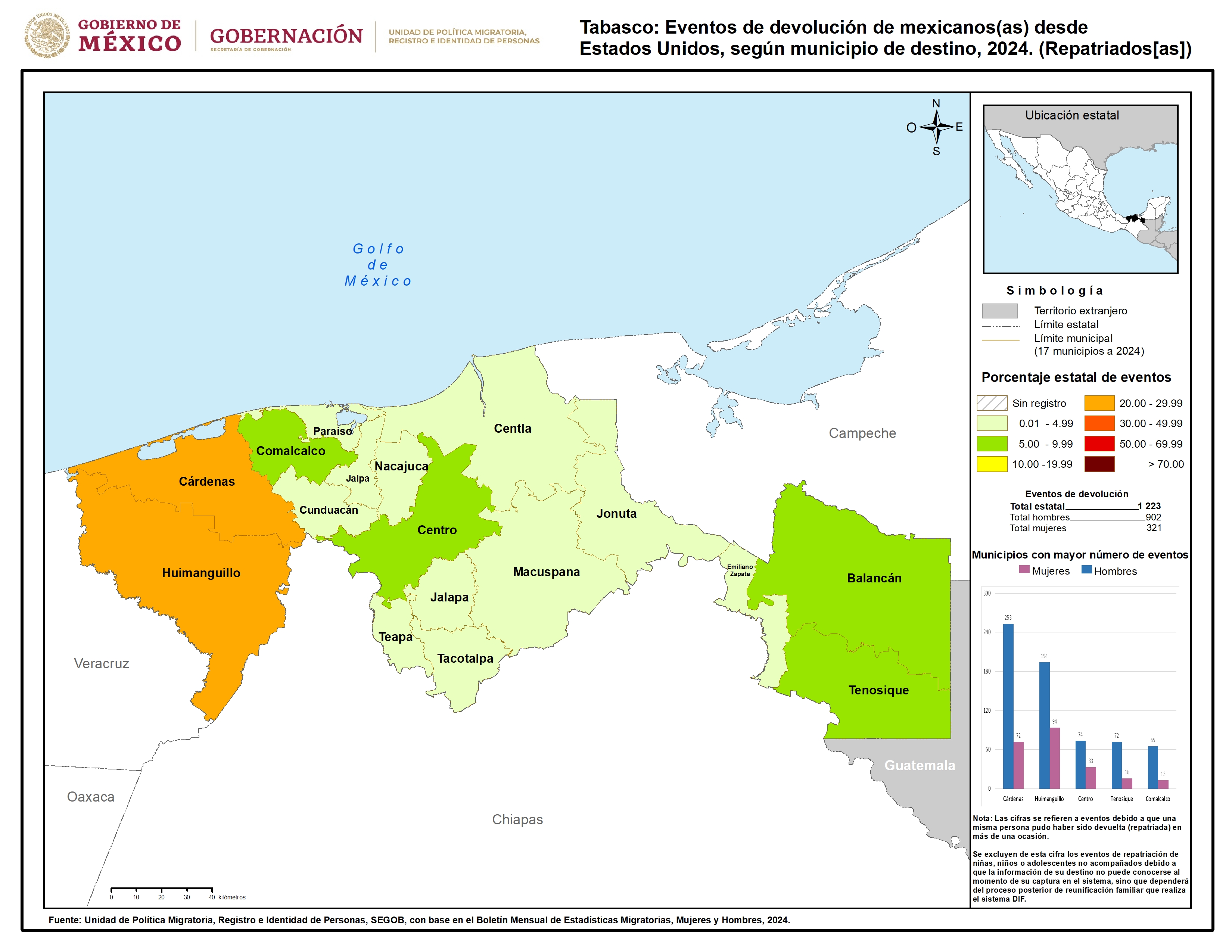 - Tabasco: Eventos de devolución de mexicanos(as) desde Estados Unidos, según municipio de destino, 2024. (Repatriados[as])
