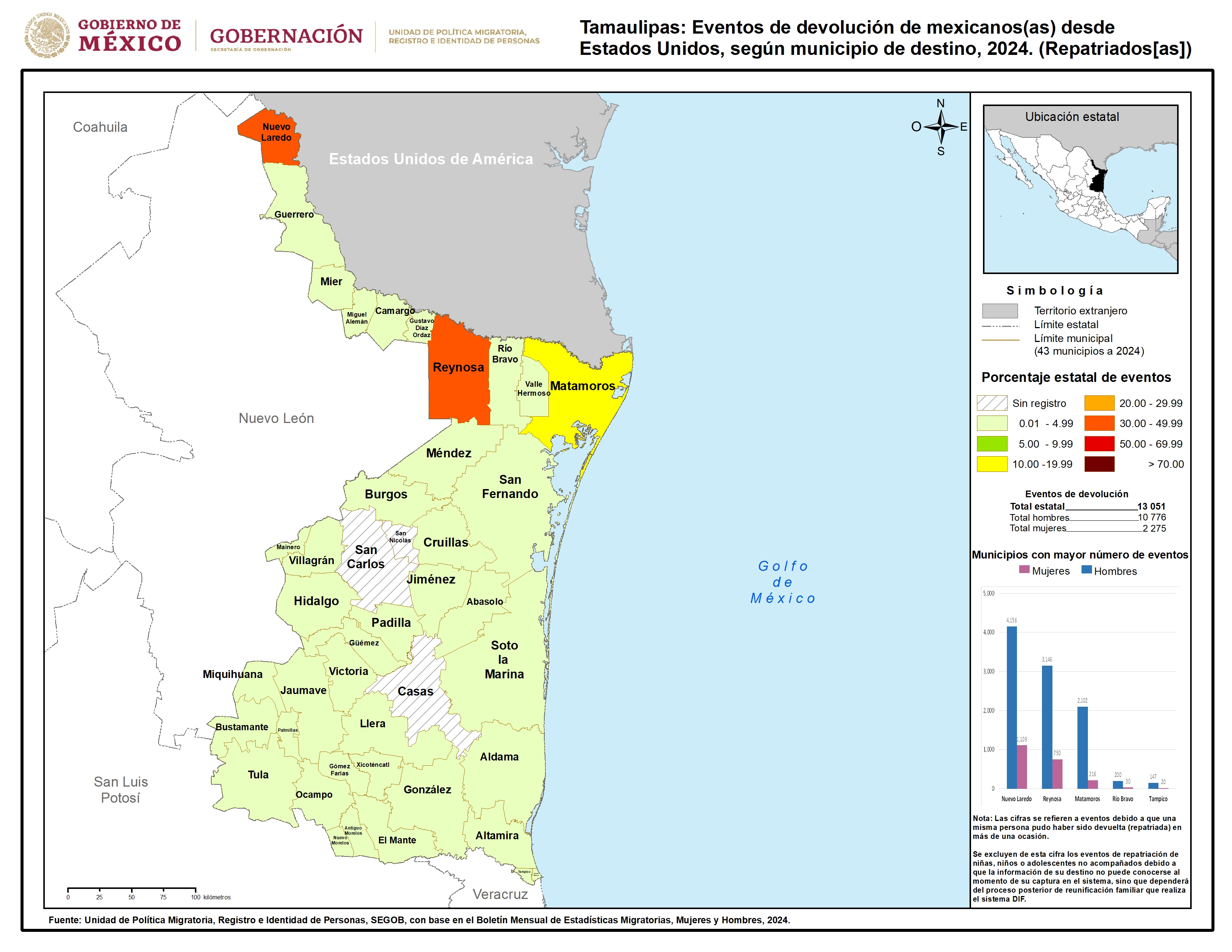 - Tamaulipas: Eventos de devolución de mexicanos(as) desde Estados Unidos, según municipio de destino, 2024. (Repatriados[as])