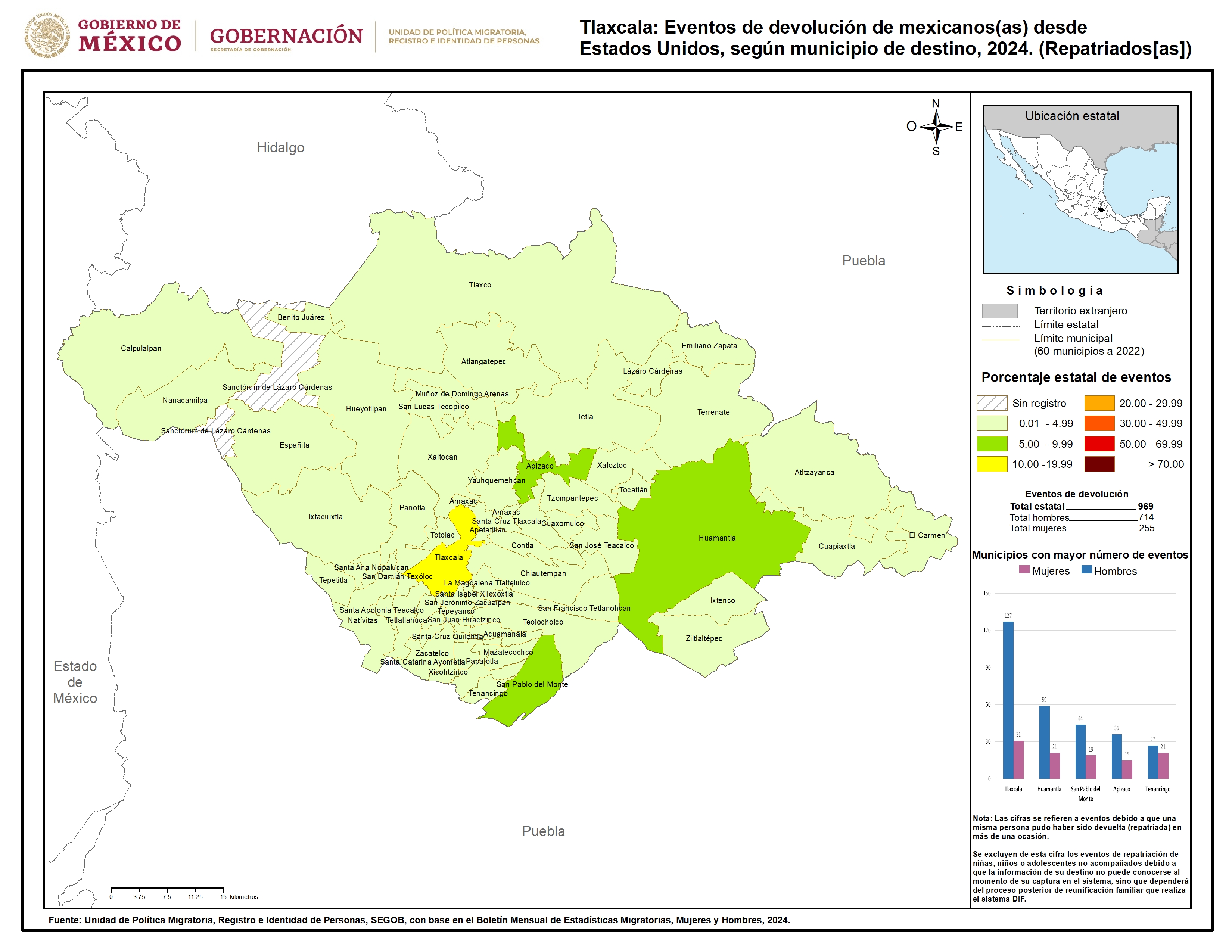 - Tlaxcala: Eventos de devolución de mexicanos(as) desde Estados Unidos, según municipio de destino, 2024. (Repatriados[as])