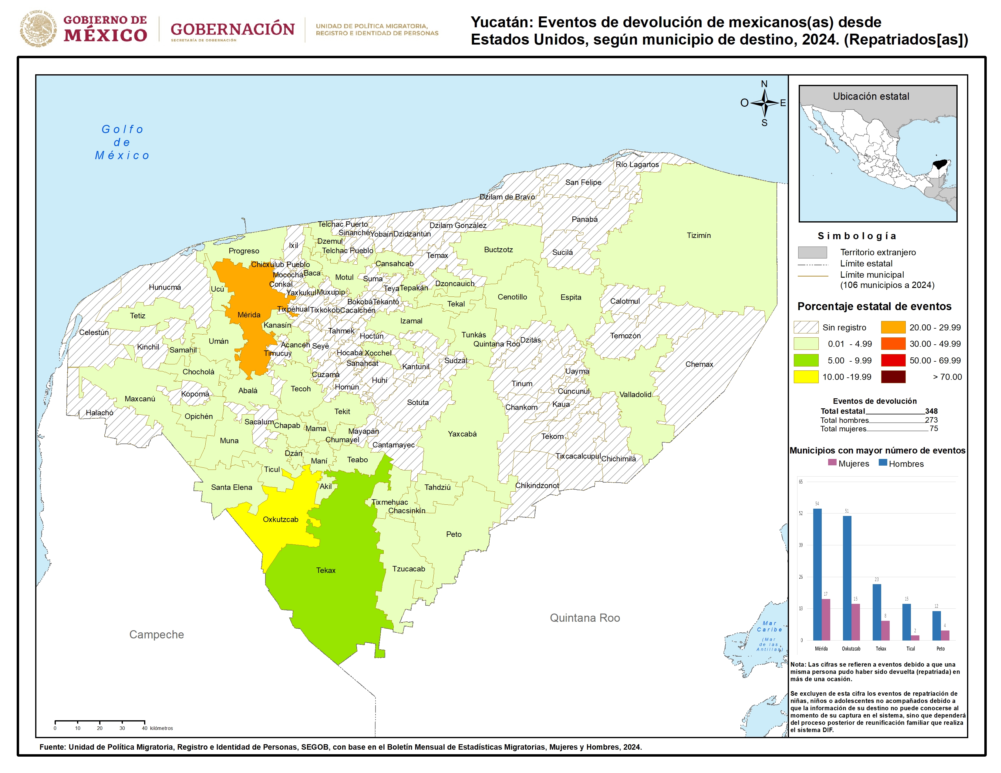 - Yucatán: Eventos de devolución de mexicanos(as) desde Estados Unidos, según municipio de destino, 2024. (Repatriados[as])