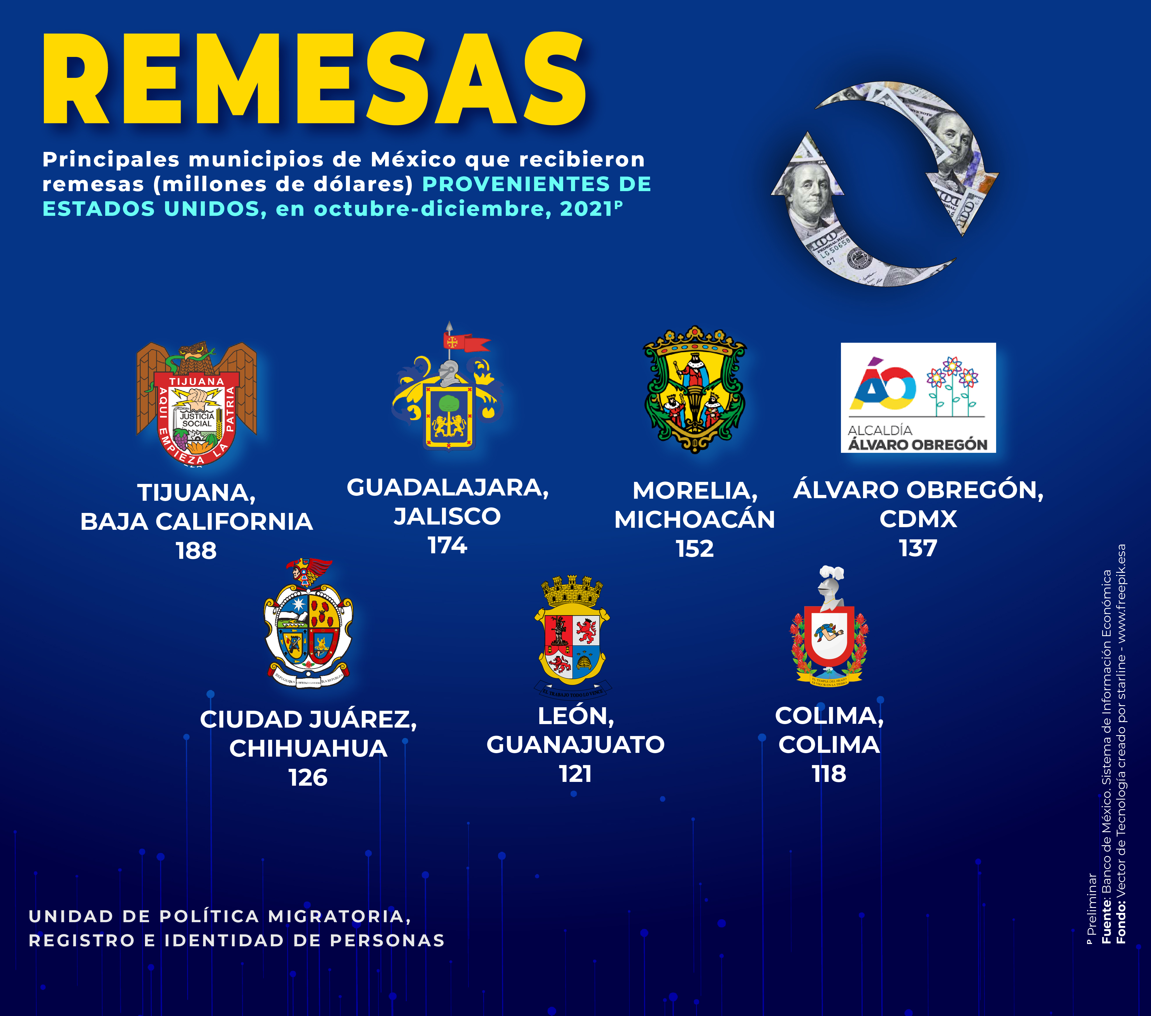 - Principales municipios de México que recibieron remesas (millones de dólares) provenientes de Estados Unidos, en octubre-diciembre, 2021