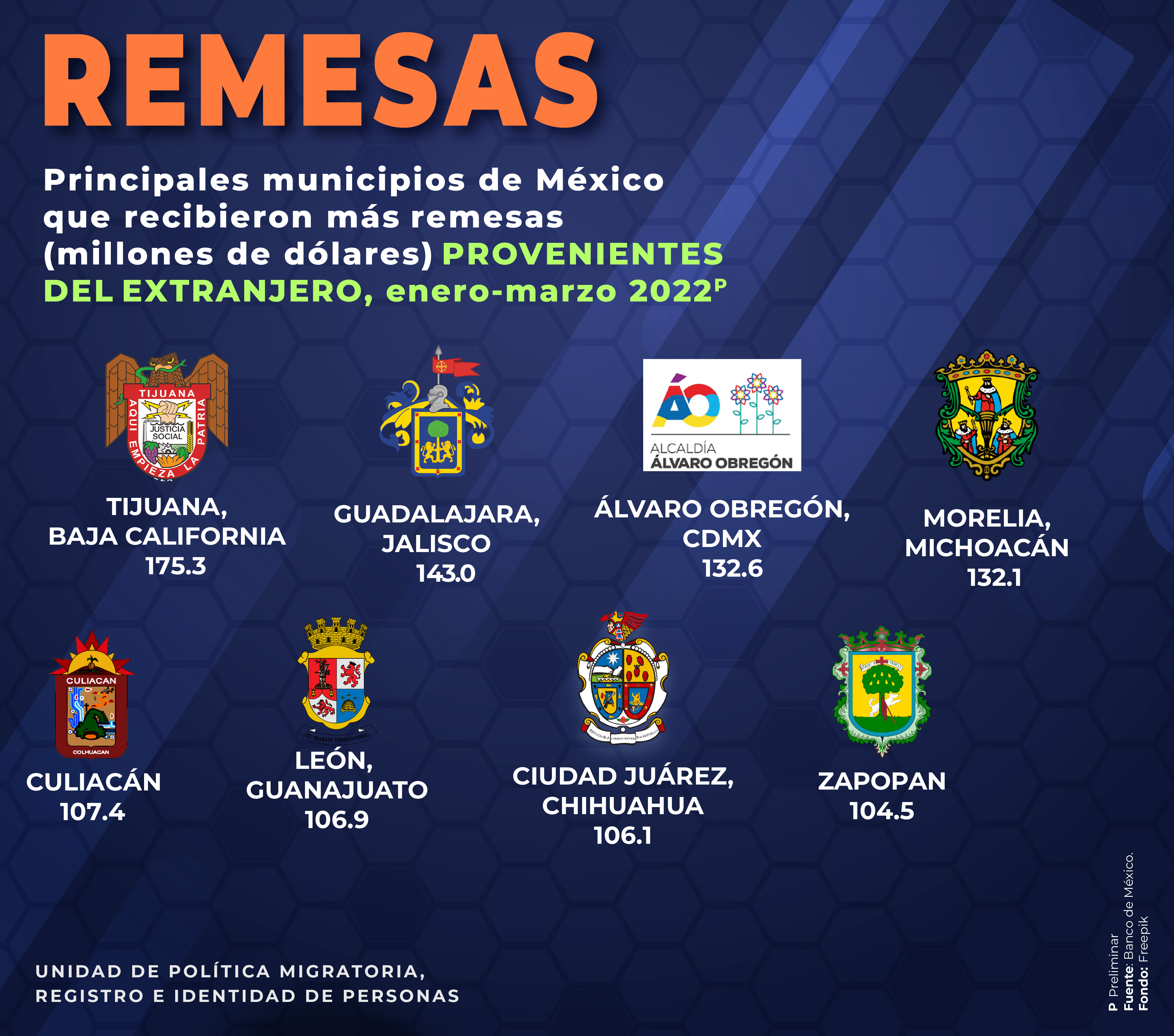 - Principales municipios de México que recibieron más remesas (millones de dólares) provenientes del extranjero, abril-junio 2022