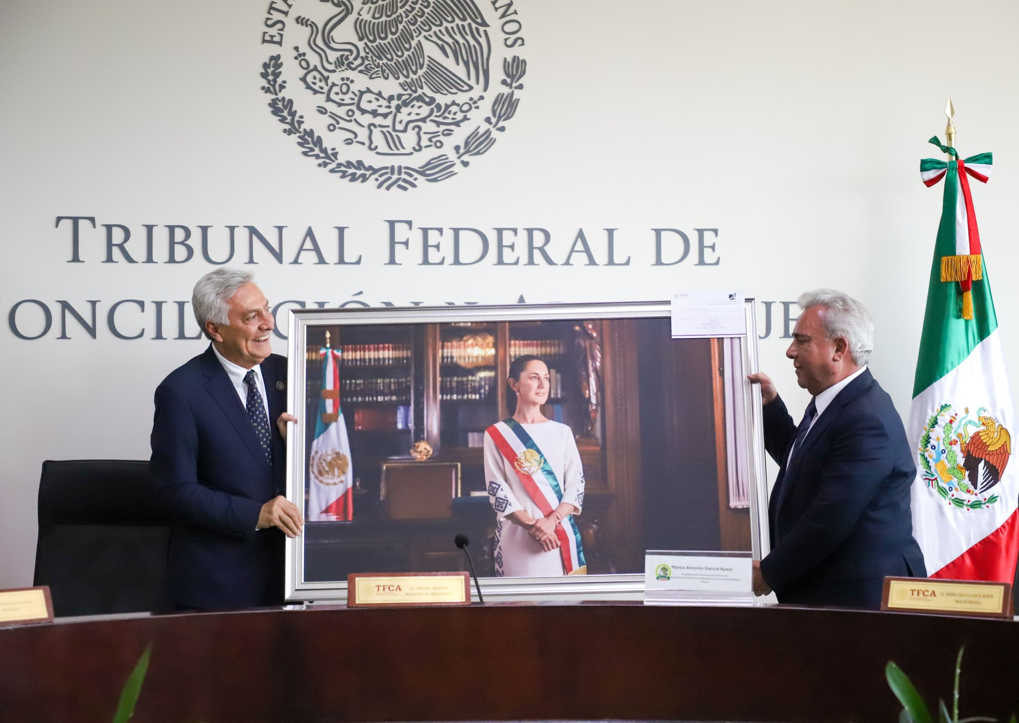 Como corolario de la Sesión, el Magistrado Presidente del TFCA obsequió a la FSTSE un retrato de la Presidenta de México Claudia Sheinbaum Pardo.