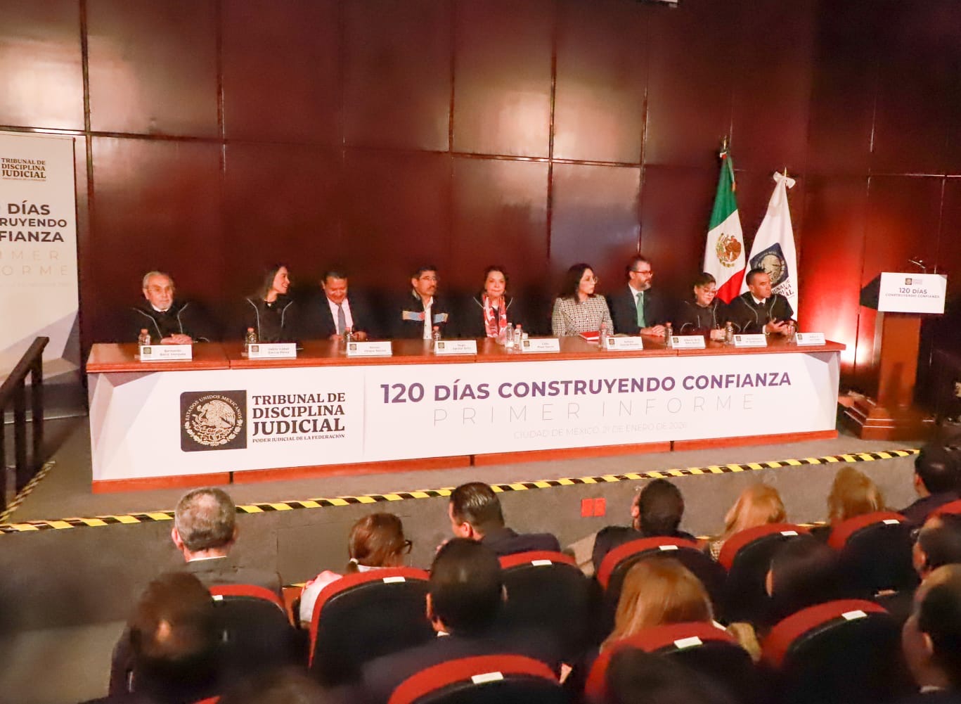 En este acto rindió su Primer Informe de Actividades la Presidenta del Tribunal de Disciplina Judicial (TDJ), Magistrada Celia Maya García, quien destacó los logros obtenidos en los primeros 120 días de existencia de este órgano del Poder Judicial de la Federación.