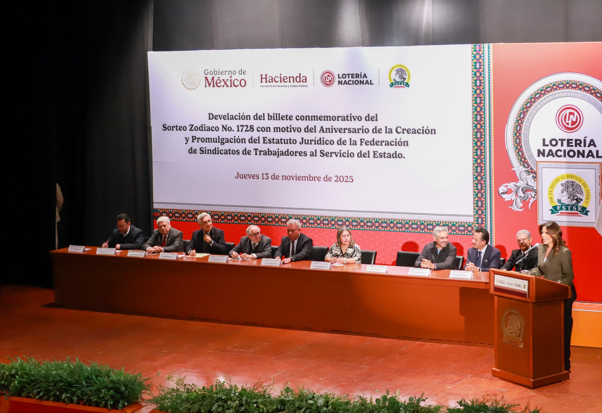 Develación del billete del Sorteo Zodiaco de la Lotería Nacional que conmemora el 87 Aniversario del Estatuto Jurídico de la Federación de Sindicatos de Trabajadores al Servicio del Estado.